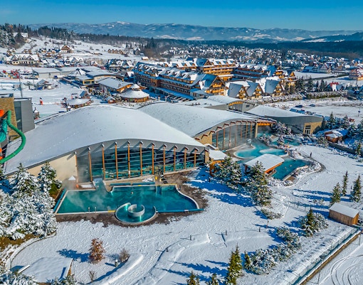 Dacă vizitați un singur centru spa în apropiere de Zakopane, alegeți Chochołowskie. Acest complex se simte ca un amestec între o stațiune montană și un loc de joacă pentru wellness, cu piscine cu apă sărată, baruri la piscină și o zonă imensă de saune.